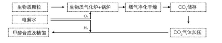 采用电解水制绿氢和CO2制甲醇,生物质中的碳源可得到回收。