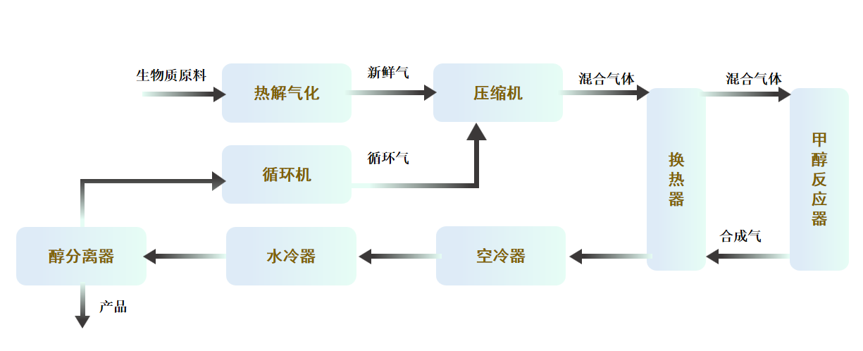 由生物质产生的含有一氧化碳、二氧化碳、氢气的新鲜气经压缩机加压后,与循环机出口的气体混合,混合气体与甲醇反应器出口的合成气进行换热后进入反应器;