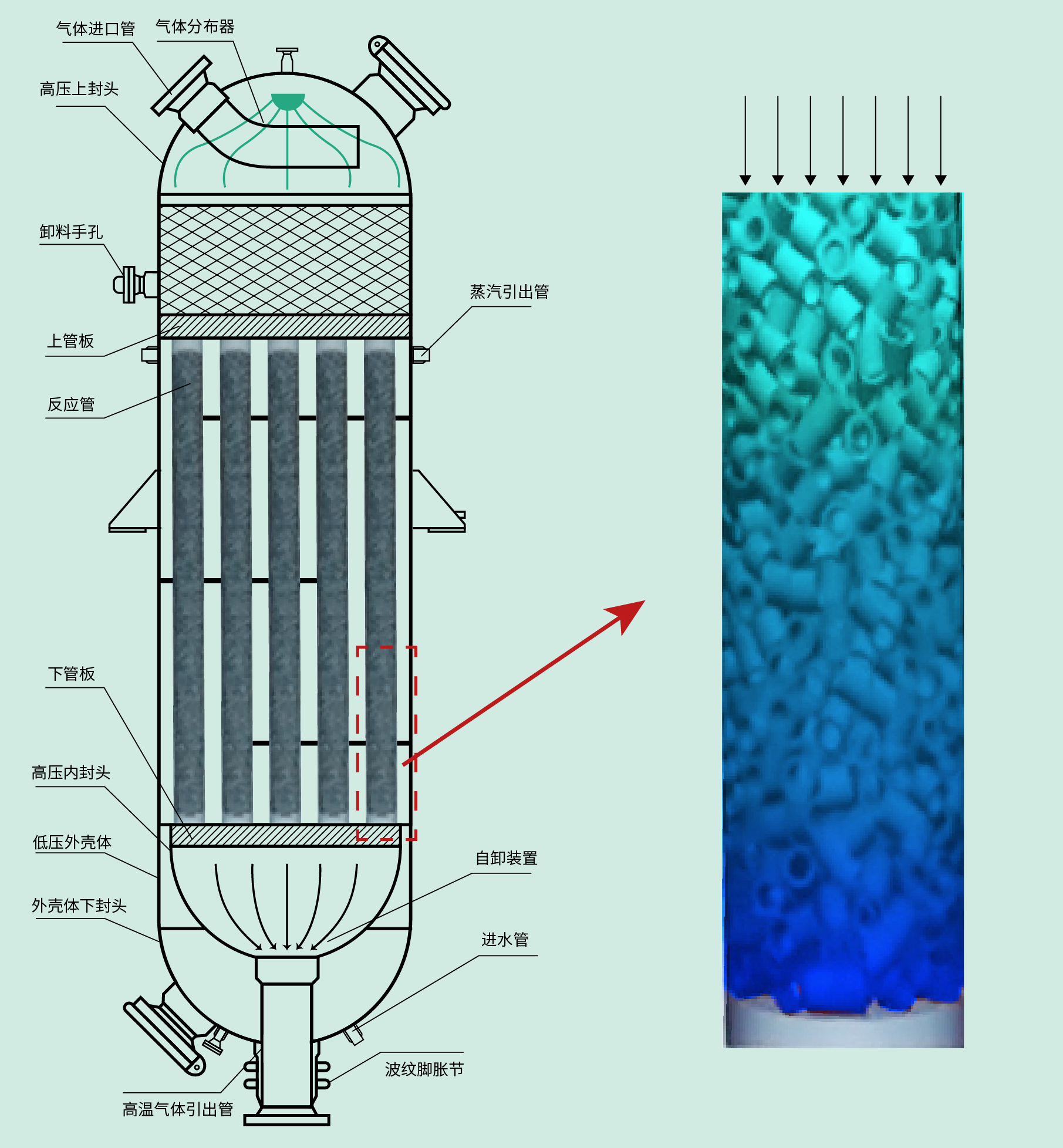 采用列管内装催化剂,管间沸水移热,送至汽包可产中压蒸汽。