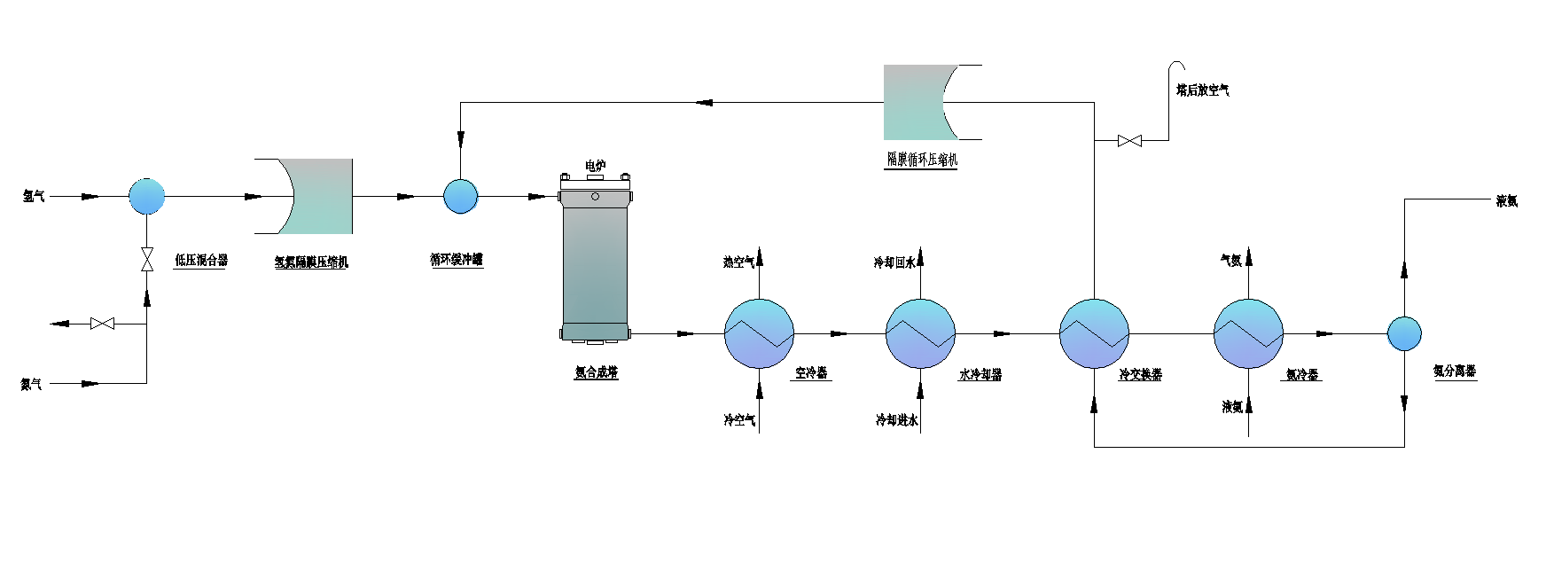 氢气与氮气按比例混合,进入压缩机压缩到9MPa,经过压缩的氢氮气与循环机出口的循环工艺气一同进入氨合成塔,工艺气在氨合成催化剂作用下发生氨合成反应,出氨合成塔的工艺气依次经过空冷器,冷交换器,氨冷器进行冷却后,进入高压氨分进行液氨分离。分离氨后的气体再进入冷交换器回收冷量后进入循环机提压,如此循环。氨分离器分离出的液氨,减压至送入中压氨分,闪蒸气返回压缩机加压利用,液氨在中压氨分罐储存。